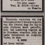 Jan Boon ProfielVoorouders Personalia Naam:Jan Boon Overleden:28 januari 1919 (Op zee (mijn)) Ouders: Reijer Boon Marijtje Koorn Broers/Zussen: Annaatje Cornelis Johanna Marretje Antje Neeltje Afbeeldingen